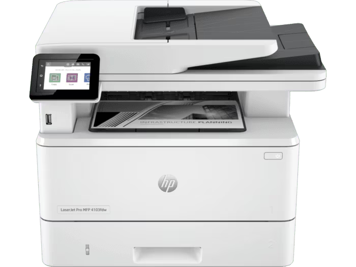 The HP LaserJet Pro 4103fdw is a robust, high-speed black-and-white multifunction laser printer designed to deliver consistent performance in busy office environments. Print, scan, copy, and fax with confidence while enjoying advanced connectivity, reliable duplex printing, and the efficiency of an automatic document feeder (ADF).